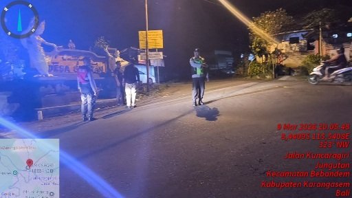 ​Patroli dipimpin oleh Perwira Pengawas (Pawas) Ipda I Wayan Sudibia. Personel menyisir seputaran Desa Jungutan, Desa Sibetan, hingga Desa Bebandem. Kehadiran lampu biru khas Polri di tengah kegelapan malam bertujuan untuk memberikan rasa aman bagi warga yang sedang beristirahat maupun yang masih beraktivitas.