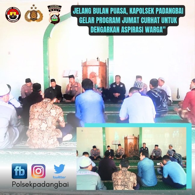 Menjelang bulan suci Ramadan, Kapolsek Padangbai, Kompol I Nyoman Merta Kariana, S.H., M.H, bersama personilnya menggelar program Jum’at Curhat sebagai upaya mendekatkan diri dengan masyarakat dan mendengarkan langsung keluhan serta aspirasi terkait situasi keamanan dan ketertiban masyarakat (Kamtibmas).