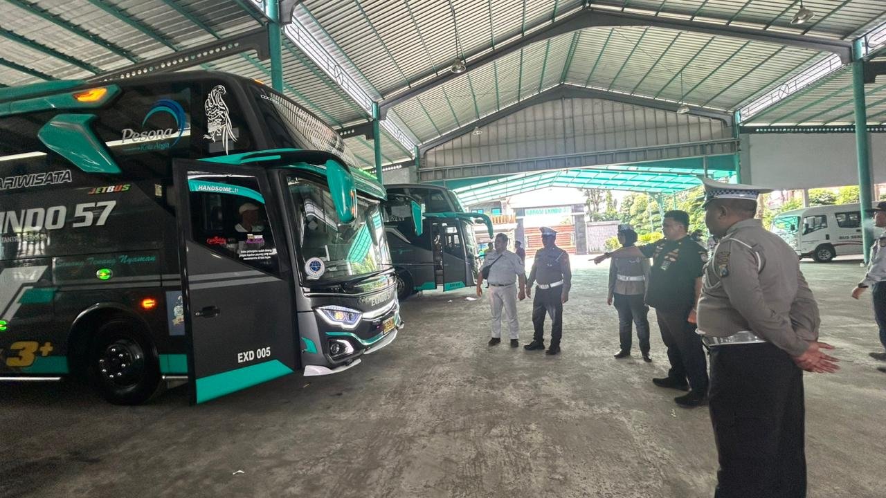 Tim gabungan secara teliti memeriksa puluhan armada bus. Pemeriksaan tidak hanya menyasar aspek teknis, tetapi juga administrasi pengemudi dan kendaraan.