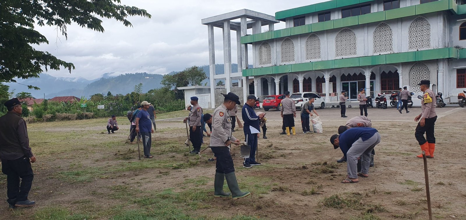 Di wilayah Kecamatan Kebayakan, personel Polsek Kota Takengon bersama Kompi 3 Batalyon D Pelopor melaksanakan gotong royong di Masjid Al Ikhlas Kampung Pinangan.