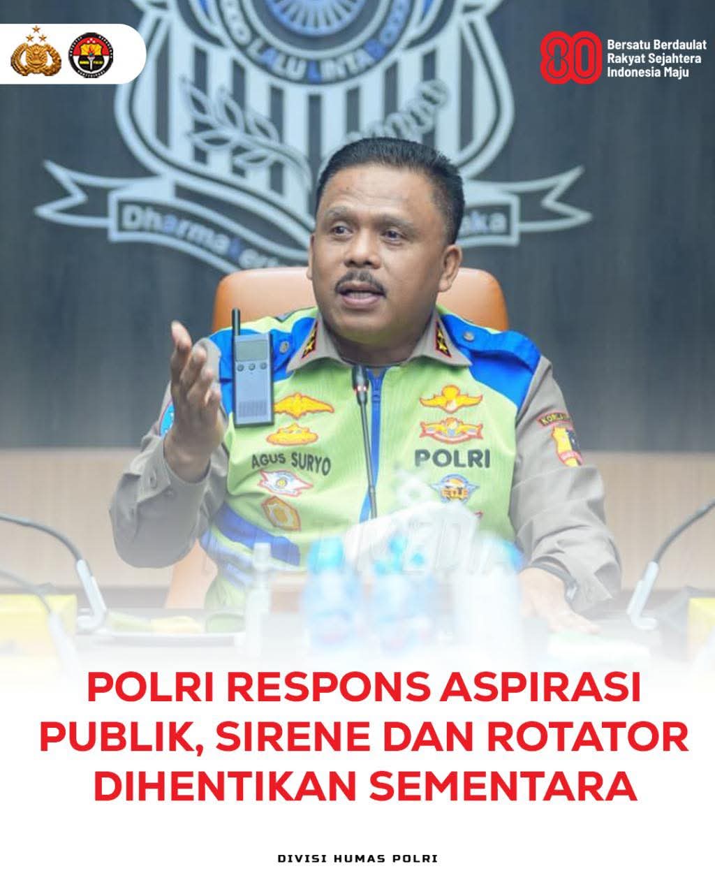 Jakarta – Kepala Korps Lalu Lintas (Kakorlantas) Polri, Irjen Pol. Drs. Agus Suryonugroho, S.H., M.Hum., menginstruksikan penghentian sementara penggunaan sirene dan lampu rotator (strobo) oleh seluruh anggota satuan lalu lintas.