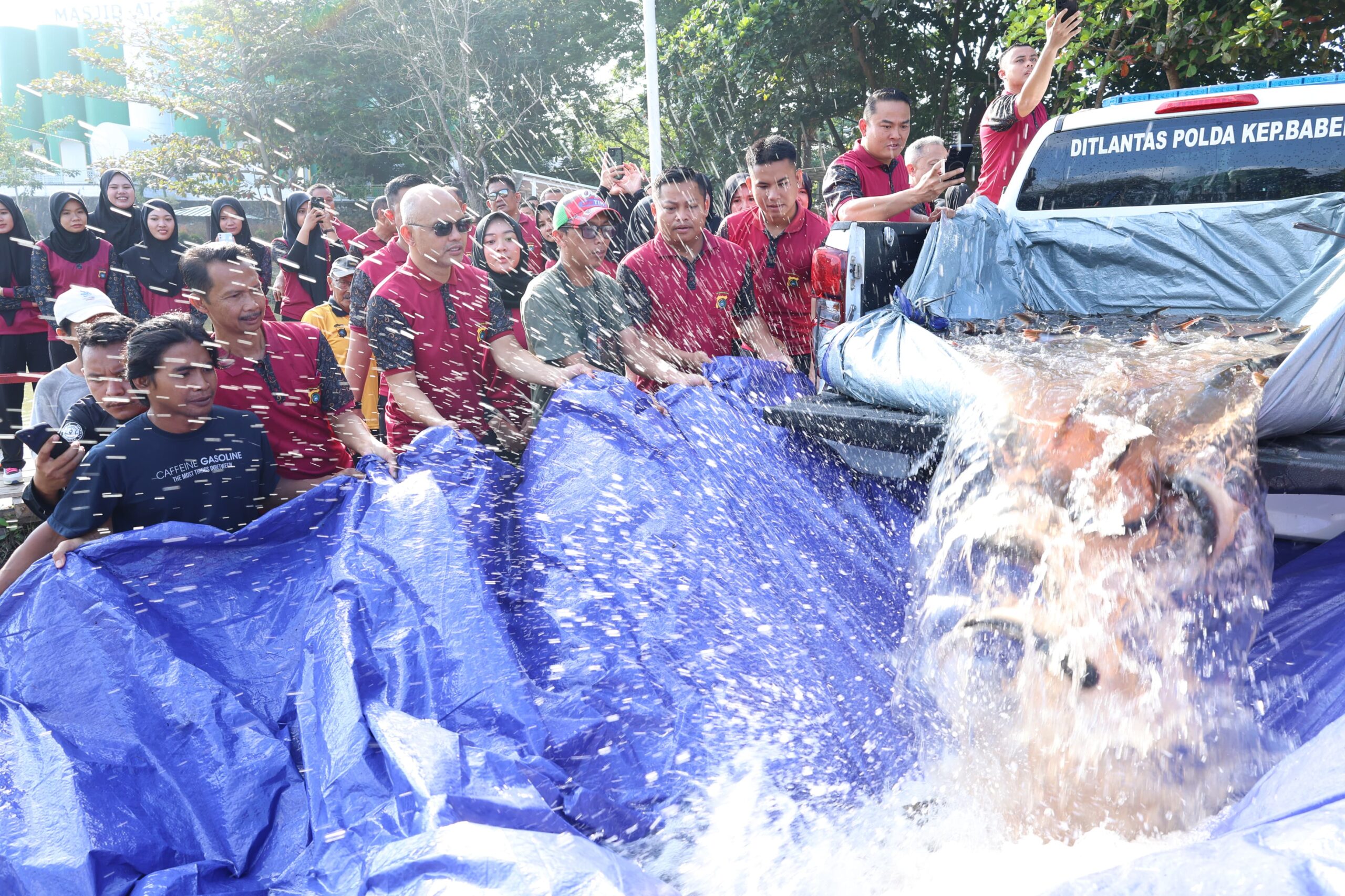 Polda Bangka Belitung kembali melepaskan sebanyak 500 ekor ikan patin di kolam Taman Bhaypark, Jumat (25/7/25) pagi. Selain ikan, Polda juga melepas 200 ekor burung dikawasan itu.