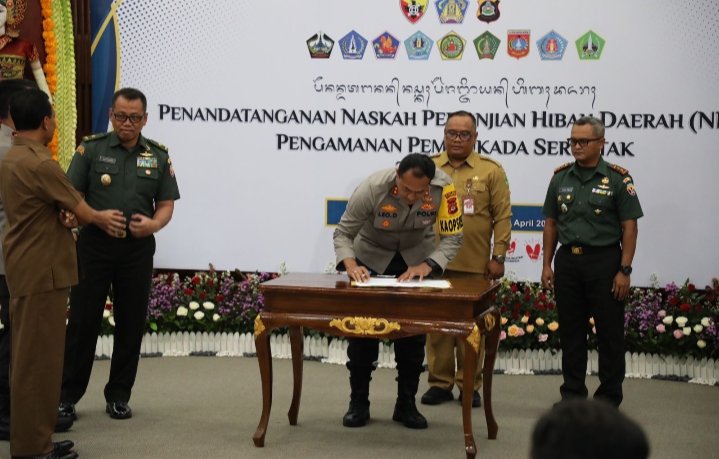 Kepala Kepolisian Daerah Bali, Irjen. Pol. Ida Bagus Kade Putra Narendra, S.I.K., M.Si., menghadiri penandatanganan Naskah Perjanjian Hibah Daerah (NPHD) Pengamanan Pemilukada Serentak Tahun 2024 di Gedung Wiswa Sabha Utama, Kantor Gubernur Bali, Senin (29/4/2024).