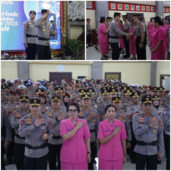 Kapolda Bali Irjen Pol. Daniel Adityajaya, S.H., S.I.K., M.Si., memimpin langsung upacara kenaikan pangkat personel Polri dan PNS Polri yang dilaksanakan di Gedung Presisi Polda Bali, Senin (5/1/2026).
