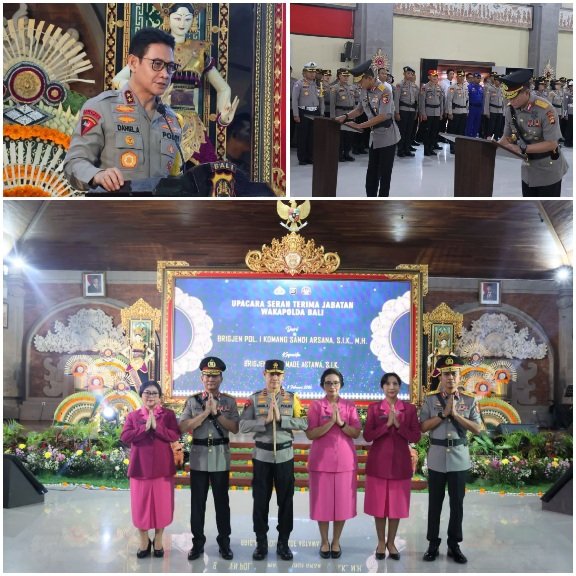 Kapolda Bali, Irjen. Pol. Daniel Adityajaya, S.H., S.I.K., M.Si. memimpin upacara serah terima jabatan (Sertijab) Wakapolda Bali dari Brigjen. Pol. I Komang Sandi Arsana, S.I.K, M.H. kepada Brigjen. Pol. I Made Astawa, S.I.K., di Gedung Presisi Mapolda Bali. Pada Kamis, (5/2/2026).