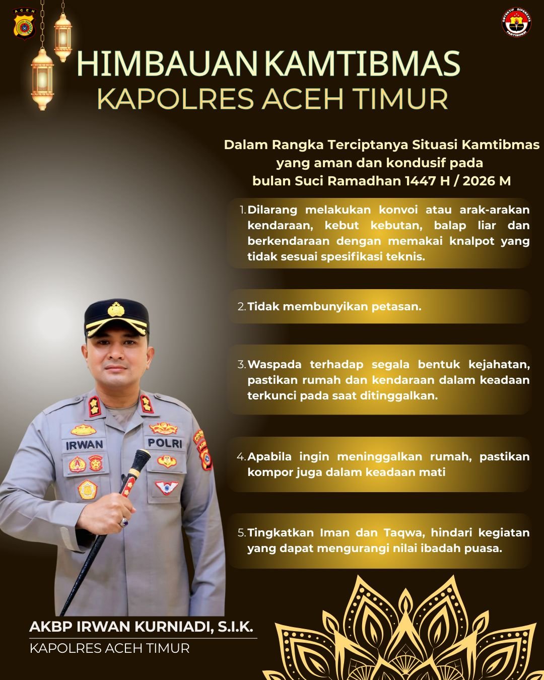 Pada bulan Suci Ramadhan 1447 Hijriah/2026 Masehi, Kapolres Aceh Timur, Polda Aceh, AKBP Irwan Kurniadi, S.I.K. mengeluarkan imbauan kamtibmas kepada seluruh masyarakat agar bersama-sama menjaga situasi keamanan dan ketertiban tetap kondusif.