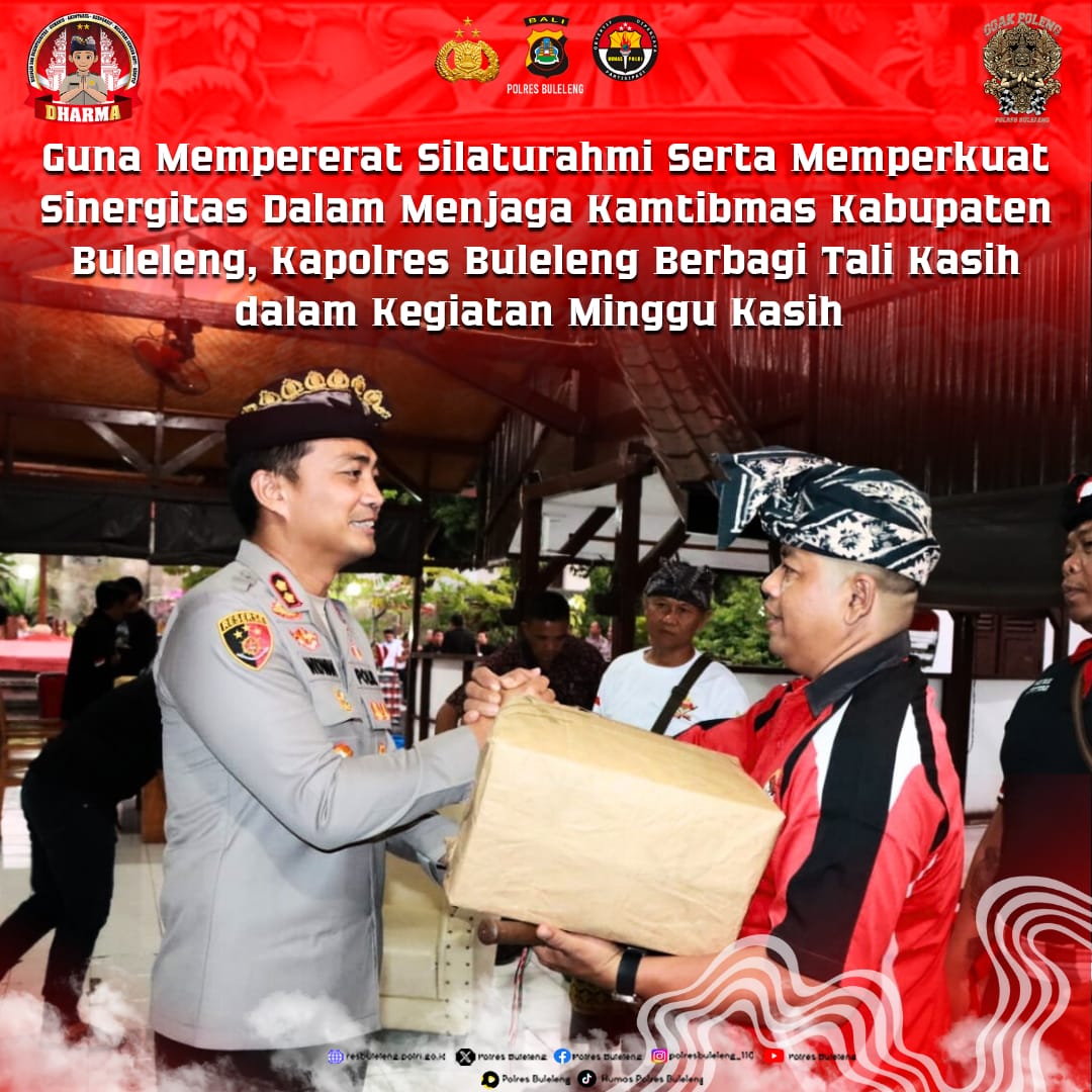 Kapolres Buleleng, AKBP Ida Bagus Widwan Sutadi, S.I.K., M.H., kembali melaksanakan kegiatan Minggu Kasih untuk mendengar aspirasi dan berbagi kasih dengan masyarakat. Kali ini, kegiatan tersebut berlangsung di Rumah Jabatan Kapolres Buleleng, dengan perwakilan dari Yayasan Kesatria Keris Bali sebagai tamu utama. Minggu 25 Agustus 2024.