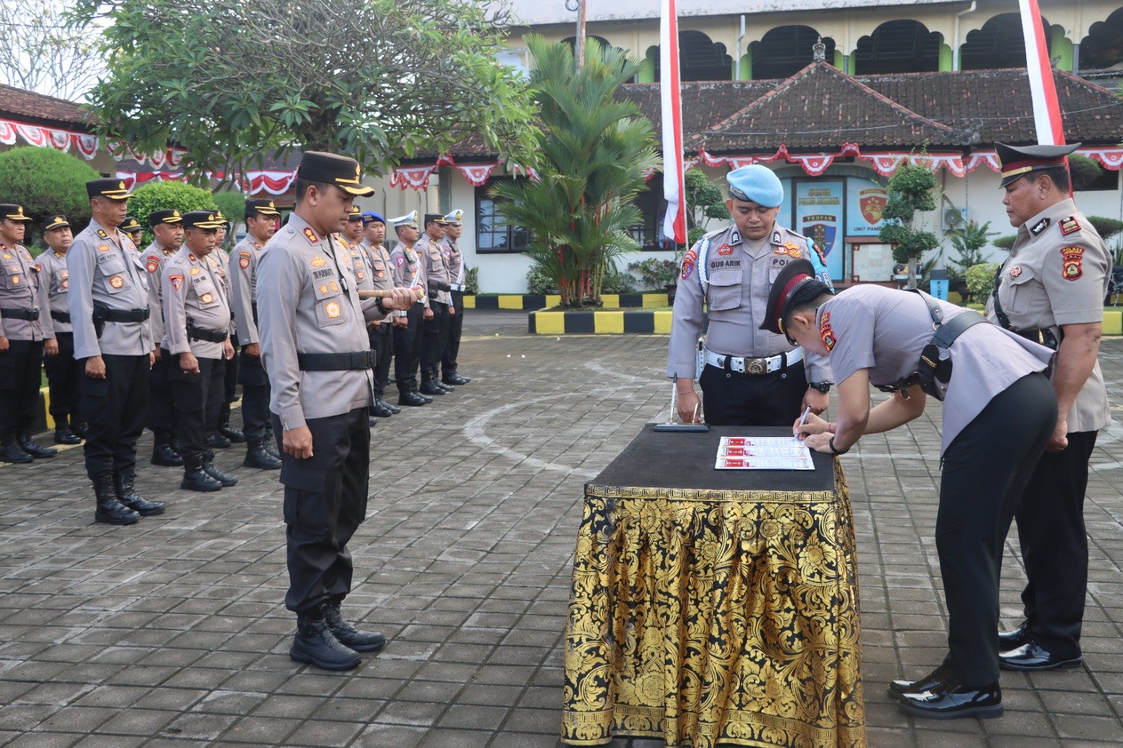Setelah pengambilan sumpah, acara dilanjutkan dengan penandatanganan berita acara sumpah dan fakta integritas sebagai symbol komitmen dalam mengemban tugas baru sebagai Kapolsek Kota Jembrana.
