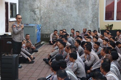 Kapolres Karangasem AKBP Joseph Edward Purba, S.H., S.I.K., M.H., memberikan arahan terkait evaluasi pengamanan Desa Adat Bugbug dan mengecek kesiapan personil Dalmas Polres Karangasem pada Selasa (23/9/2025) seusai Apel Pagi.