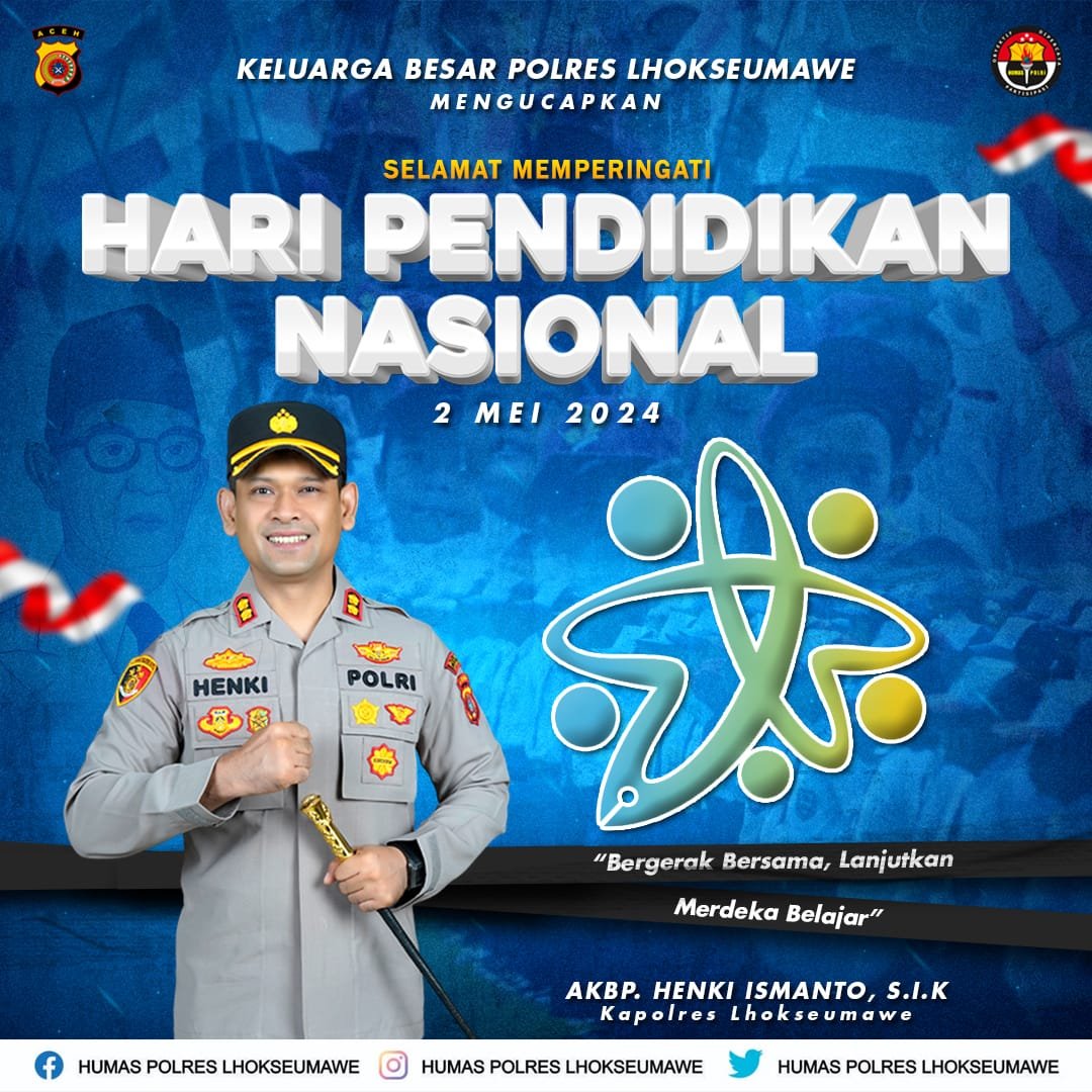 Dalam momen yang bersejarah bagi dunia pendidikan Nasional, Kapolres Lhokseumawe turut memberikan ucapan selamat untuk memperingati Hari Pendidikan Nasional.