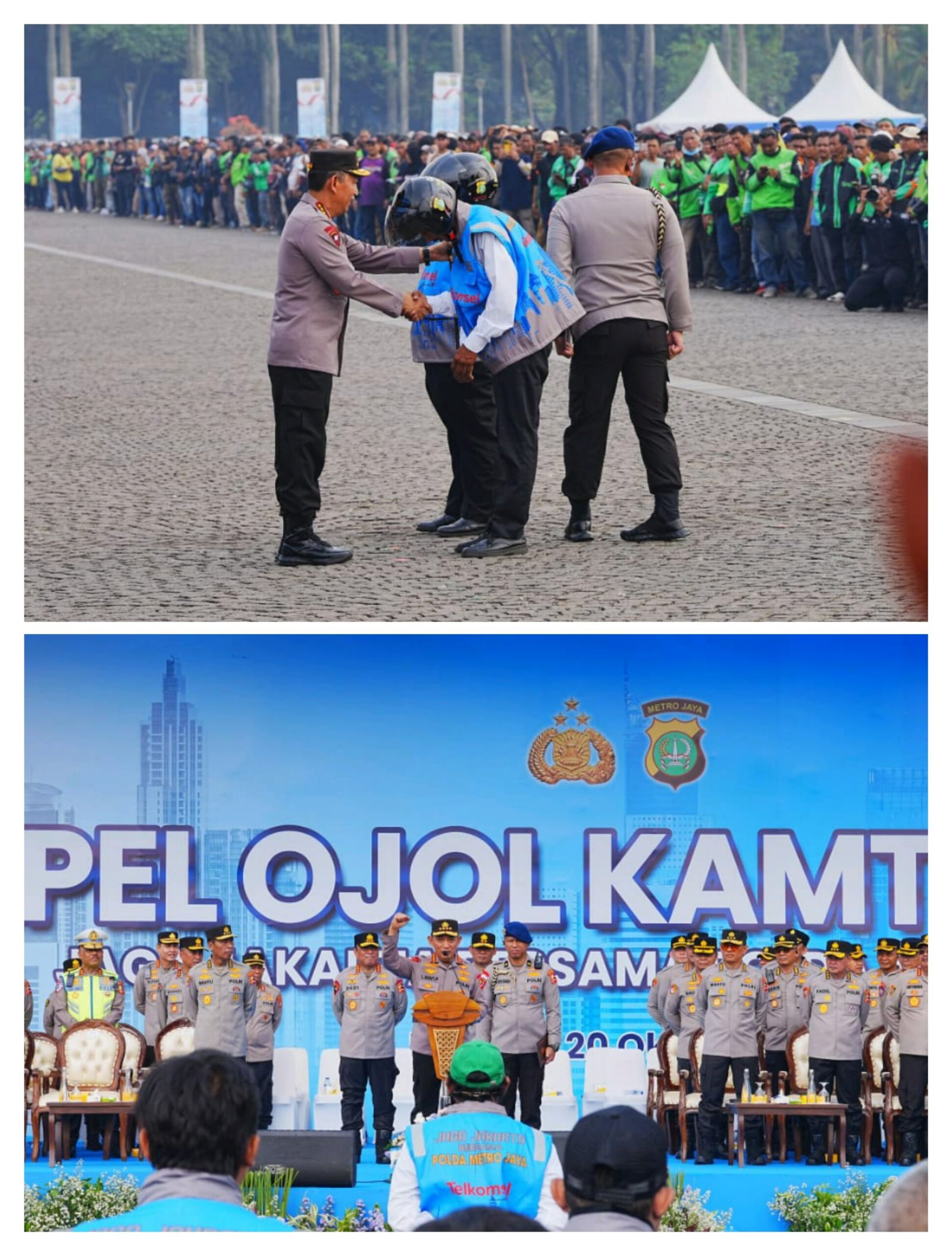 Pantauan di lokasi, ratusan pengemudi ojol hadir dengan mengenakan rompi biru bertuliskan “Jaga Jakarta bersama Polda Metro Jaya”. Suasana apel semakin khidmat ketika Kapolri secara simbolis menyerahkan helm dan rompi kepada perwakilan ojol. Turut hadir Wakapolri Komjen Dedi Prasetyo, Kapolda Metro Jaya Irjen Asep Edi Suheri, pejabat utama Mabes Polri, serta jajaran Kapolres Polda Metro Jaya.