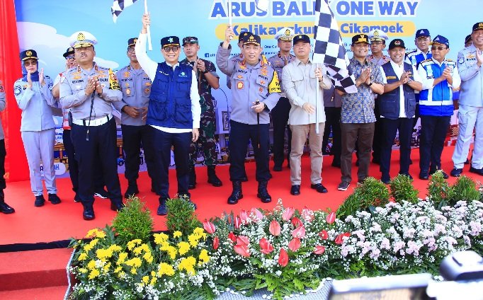 Setelah itu, Kapolri memimpin langsung flag off one way nasional tersebut. Terlihat Kakorlantas Irjen Agus Suryonugroho mendampingi langsung di lokasi.