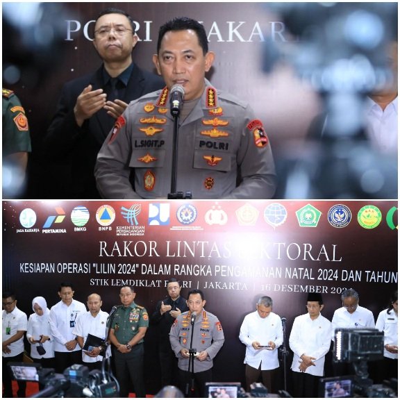 Kapolri Jenderal Polisi Drs. Listyo Sigit Prabowo memimpin rapat lintas sektoral persiapan pengamanan libur Natal dan tahun baru (Nataru). Dalam rapat tersebut hadir Menteri Perhubungan Dudy Purwagandhi, Panglima TNI Agus Subiyanto, Menteri Agama Nasaruddin Umar, Kakorlantas Polri Irjen Pol Aan Suhanan dan instansi terkait lainnya. Senin, (16/12/2024).