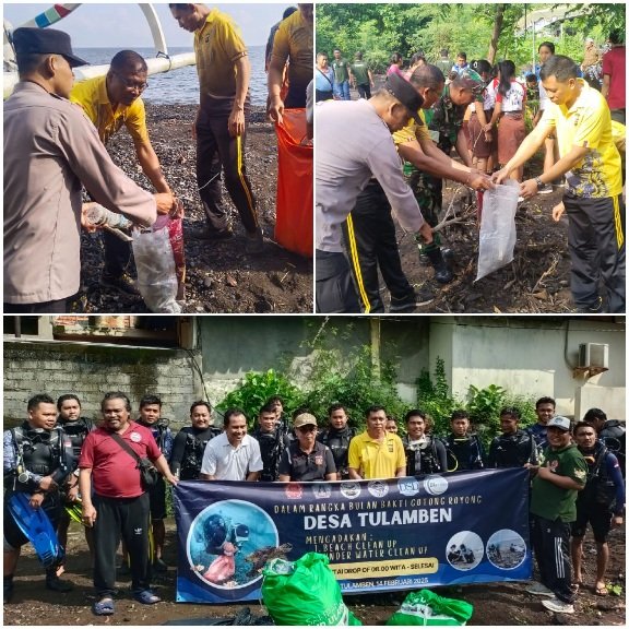 Kapolsek Kubu, AKP. I Guati Agung Bagus Sueja, S.IP bersama anggota menghadiri kegiatan Beach Clean Up dan Under Water Clean up dalam rangka Bulan Bakti Gotong Royong Desa Tulamben di Pantai Drof Off Bd. Tulamben, Desa Tulamben, Kecamatan kubu Kabupaten karangasem. Pada Jum’at (14/2/2025).