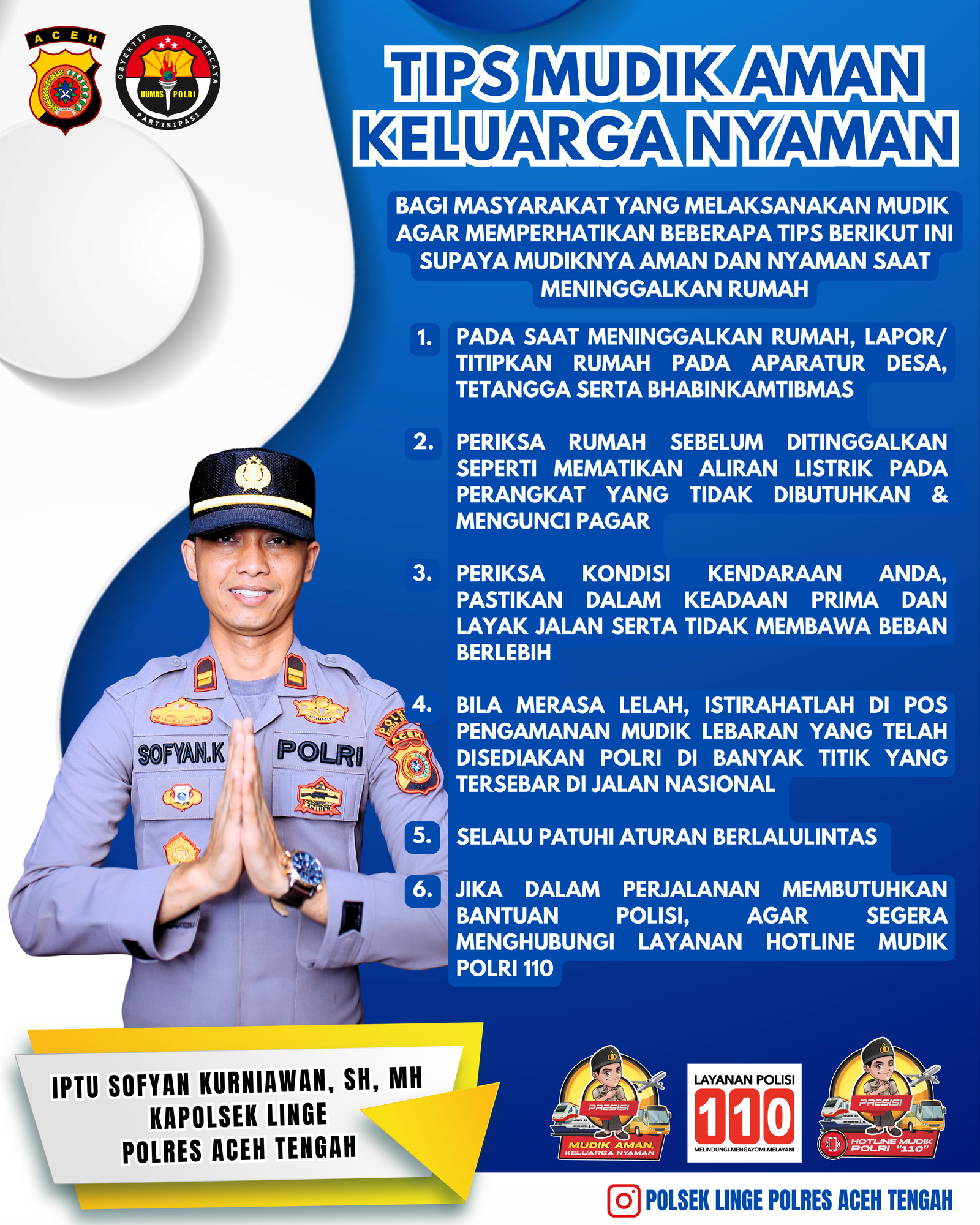 Namun, dalam perjalanan mudik, keamanan dan kenyamanan menjadi faktor utama yang perlu diperhatikan. Menyikapi hal ini, Kapolsek Linge, Iptu Sofyan Kurniawan, membagikan enam tips penting agar perjalanan mudik berlangsung aman dan nyaman: