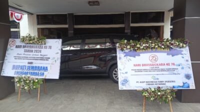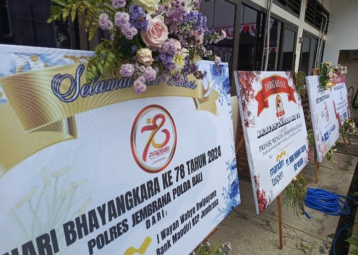 Salah satu bentuk apresiasi dari beberapa elemen masyarakat Jembrana, tampak Puluhan karangan bunga yang berisi ucapan Selamat Hari Bhayangkara ke – 78 menghiasi Mapolres Jembrana, karangan bunga yang di ketahui dari masyarakat, instansi pemerintah dan swasta tersebut nampak berjejer di Halaman Depan Mapolres Jembrana. Selasa ( 2/6/2024 ).
