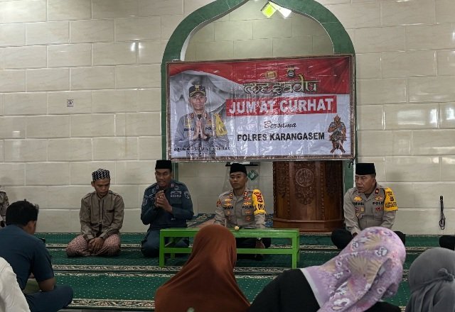 Kasat Binmas Polres Karangasem AKP I Wayan Sumerti, S.H., dampingi Kapolres Karangasem AKBP I Nenfah Sadiarta, S.I.K., S.H., M.K.P, dalam kegiatan Jum’at Curhat yang bertempatan di Masjid Al- Falah Pelabuhan Padangbai, Kecamatan Manggis, Kabupaten Karangasem. Kegiatan yang dihadiri oleh PJU Polres Karangasem, pada Jum’at (28/3/2025).