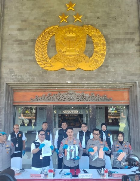 Kapolda Bali Irjen Pol Daniel Adityajaya S.H., S.I.K., M.Si., didampingi Direskrimum Kombes Pol Dr. I Gede Adhi Mulyawarman S.I.K., S.H., M.H., Kabid Propam Ketut Agus Kusmayadi S.I.K., M.H, serta Kasubid Penmas AKBP Rina Isriana Dewi S.I.K., mewakili Kabid Humas dan Kapolresta Denpasar Kombes Pol Leonardo David Simatupang S I.K., M.H., Konfrensi Pers di Loby Mapolda, senin 30/3/2026.