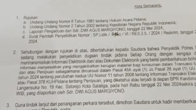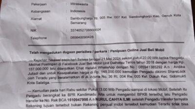 Salatiga, Kamis 3 Oktober 2024 – Dwi Agus Margiyono, warga Sembungharjo mengungkapkan kekecewaannya atas lambatnya proses penyelidikan kasus penipuan yang dialaminya. Dwi melaporkan kasus tersebut ke Polres Salatiga pada tanggal 22 bulan Mei 2024, terkait dugaan pelanggaran Pasal 378 KUHP.