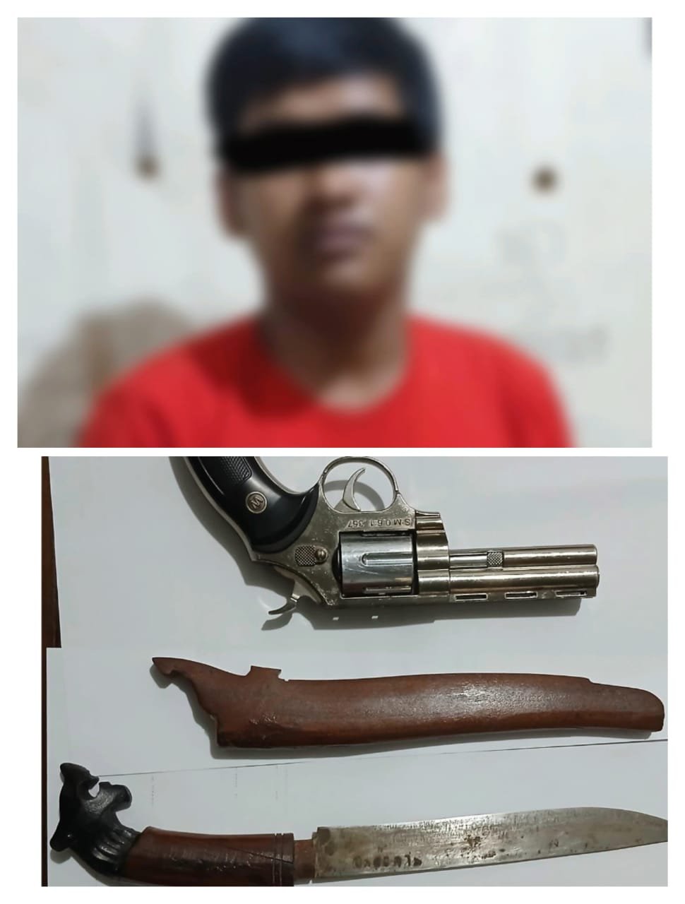 Anggota Sat Reskrim Polsek Simpang Pematang mengamankan seorang laki laki yang kedapatan membawa Senjata Tajam dan Korek Api berbentuk Pistol di Jalan Lintas Timur, KM 180 Desa Simpang Pematang, Kabupaten Mesuji pada Senin malam 21 April 2025