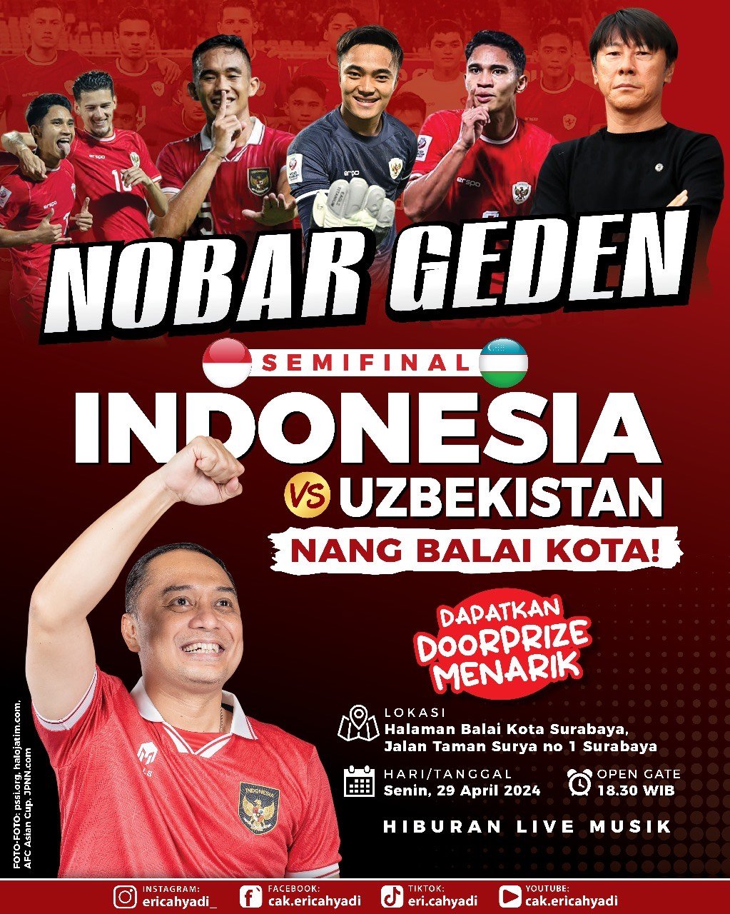 Surabaya |Jatim | Pemerintah Kota (Pemkot) Surabaya bekerjasama dengan MNC Group bakal menggelar nonton bareng (nobar) di Balai Kota Surabaya pada Senin (29/4/2024) malam. Nobar kali ini digelar khusus untuk mendukung Timnas U-23 Indonesia kontra Uzbekistan dalam semifinal Piala Asia U-23 2024 yang digelar di Stadion Abdullah bin Khalifa Stadium, Doha, Qatar. Pertandingan seru yang disiarkan live di RCTI itu akan berlangsung sekitar pukul 21.00 WIB.