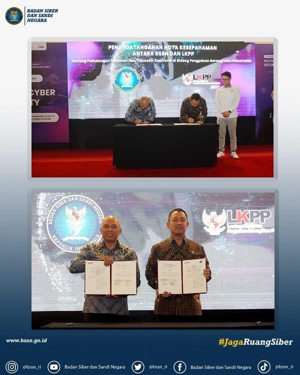 Badan Siber dan Sandi Negara (BSSN) dan Lembaga Kebijakan Pengadaan Barang/Jasa Pemerintah (LKPP) sepakat menandatangani Nota Kesepahaman (NK) tentang Pelindungan Informasi dan Transaksi Elektronik di Bidang Pengadaan Barang/Jasa Pemerintah. Penandatanganan NK dilakukan oleh Kepala BSSN Nugroho Sulistyo Budi dan Kepala LKPP Hendrar Prihadi di Jakarta, pada Jum’at (9/5/2025).