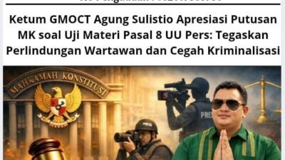 Selasa, 20 Januari 2026 – Agung Sulistio, selaku Ketua Umum Gabungan Media Online dan Cetak Ternama (GMOCT), Pimpinan Redaksi Sahabat Bhayangkara Indonesia (Kabarsbi.com), serta Ketua II DPP Lembaga Perlindungan Konsumen Republik Indonesia (LPK-RI), menyoroti secara serius hasil Putusan Mahkamah Konstitusi yang mengabulkan sebagian permohonan uji materi terhadap Pasal 8 Undang-Undang Nomor 40 Tahun 1999 tentang Pers. Informasi terkait putusan ini diperoleh GMOCT dari media online Kabarsbi yang tergabung di dalam organisasi tersebut. Putusan ini dinilai sebagai tonggak penting dalam memperkuat kepastian hukum bagi insan pers di Indonesia.