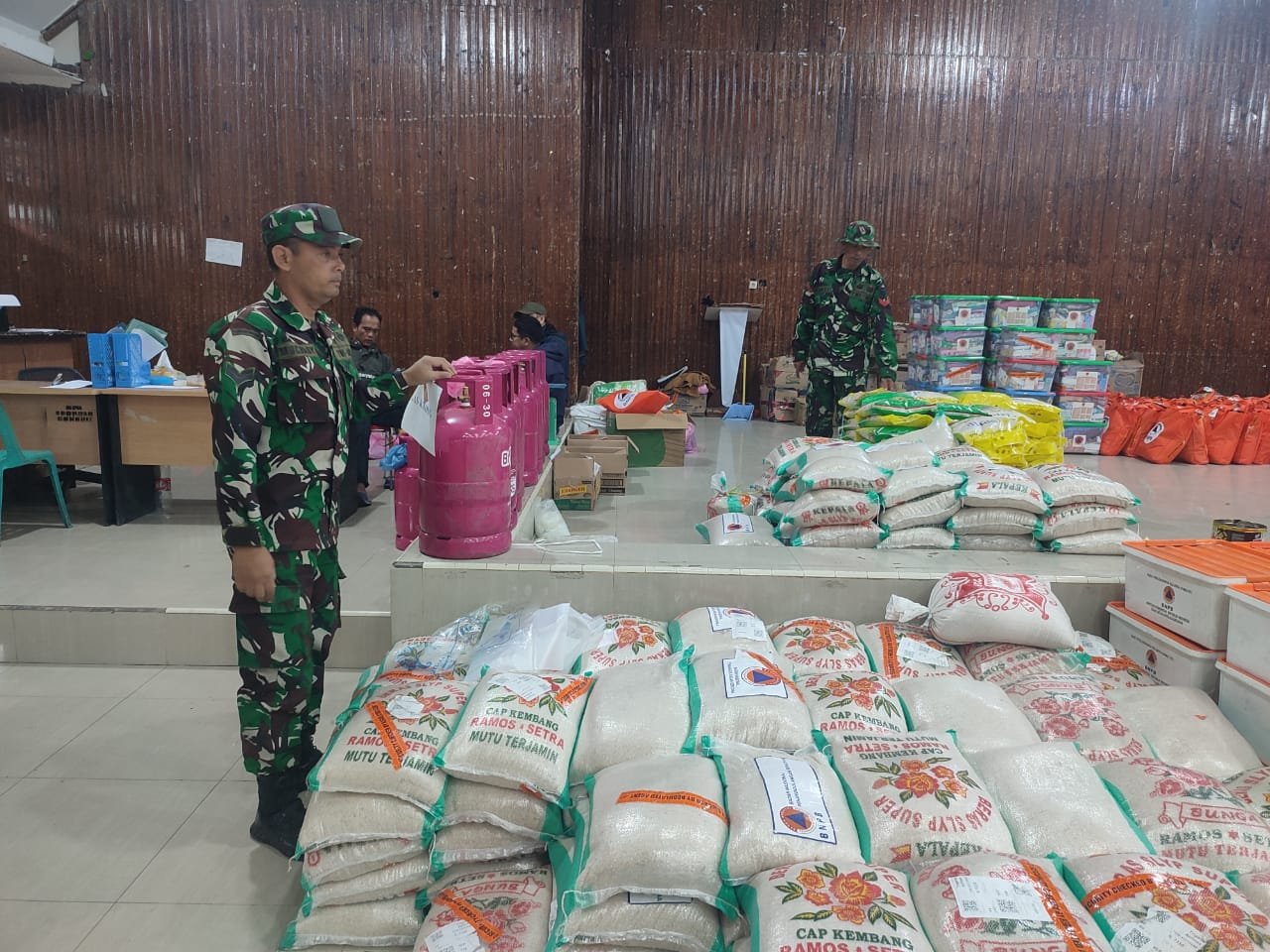 Anggota Koramil 02/Bebesen (BBS) dipimpin Sertu Muhadi melaksanakan pengamanan gudang logistik yang berada di Gedung Olahraga dan Seni (GOS) Desa Blang Kolak I, Kecamatan Bebesen, Kabupaten Aceh Tengah, pada Minggu, 28 Desember 2025 pagi.