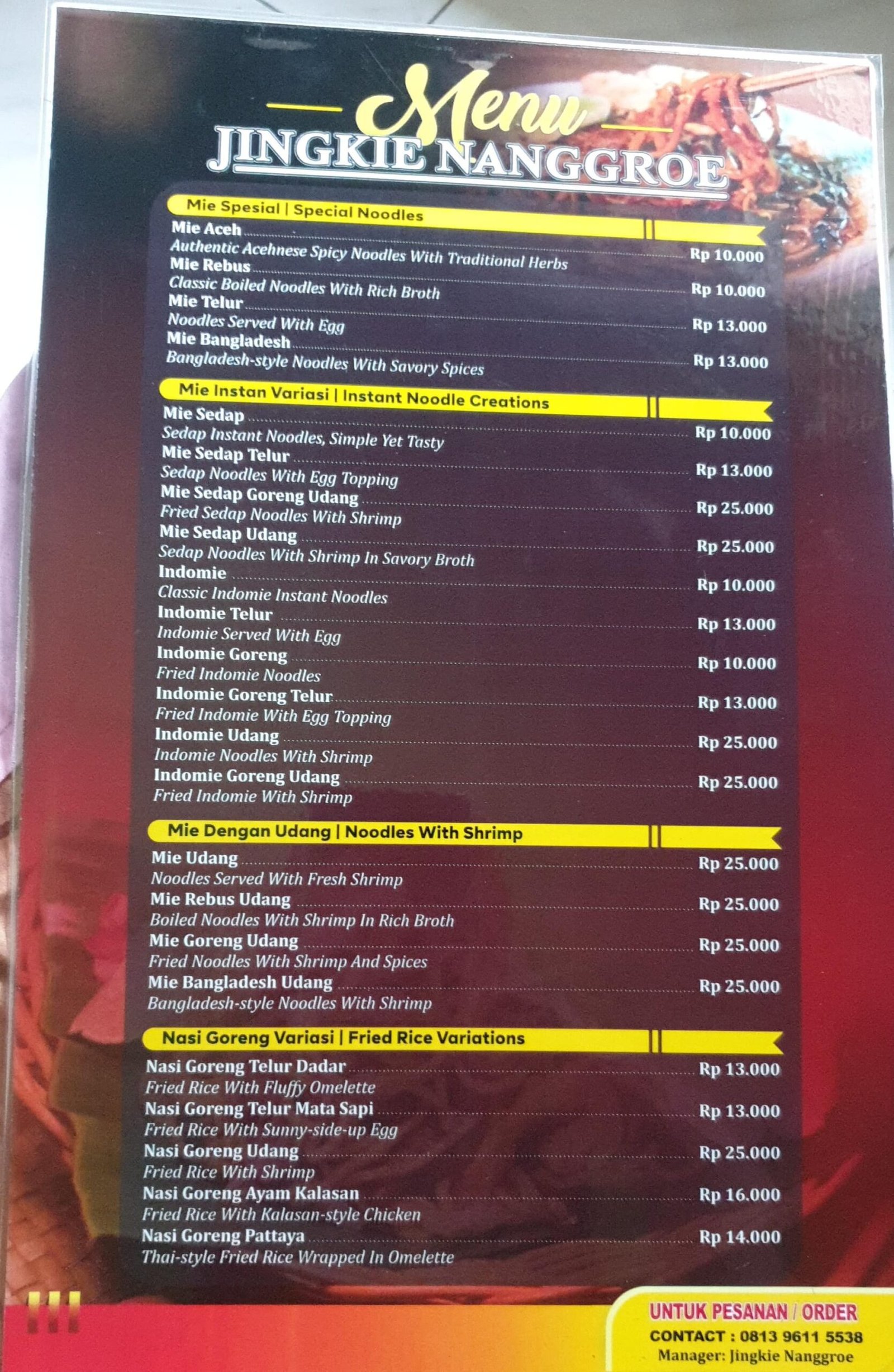 Menu yang tersedia pun beragam: Mie Aceh klasik, Indomie Telur, Mie Bangladesh, hingga Nasi Goreng Jingkie Nanggroe yang kini menjadi primadona. Semua diolah menggunakan bahan pilihan berkualitas premium agar cita rasa tetap terjaga.