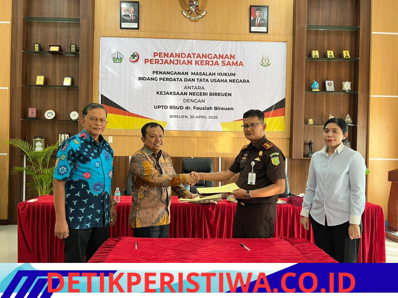 Kejaksaan Negeri (Kejari) Bireuen bersama Rumah Sakit Umum Daerah (RSUD) Dr. Fauziah Bireuen resmi menandatangani Nota Kesepahaman (MoU) dalam bidang Perdata dan Tata Usaha Negara sebagai langkah strategis dalam memperkuat sinergi kedua lembaga dalam menangani permasalahan hukum di Ruang Aula Kejaksaan Negeri Bireuen hari Kamis 30 April 2026