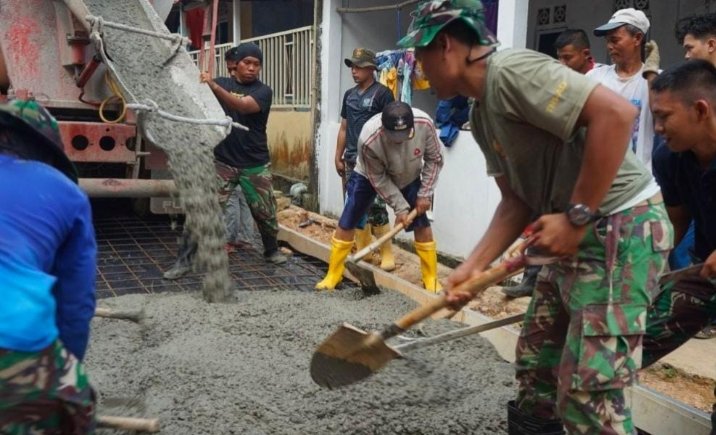 Meski cuaca tidak menentu kadang hujan dan panas personel Satgas terus melanjutkan pekerjaan fisik pengecoran.