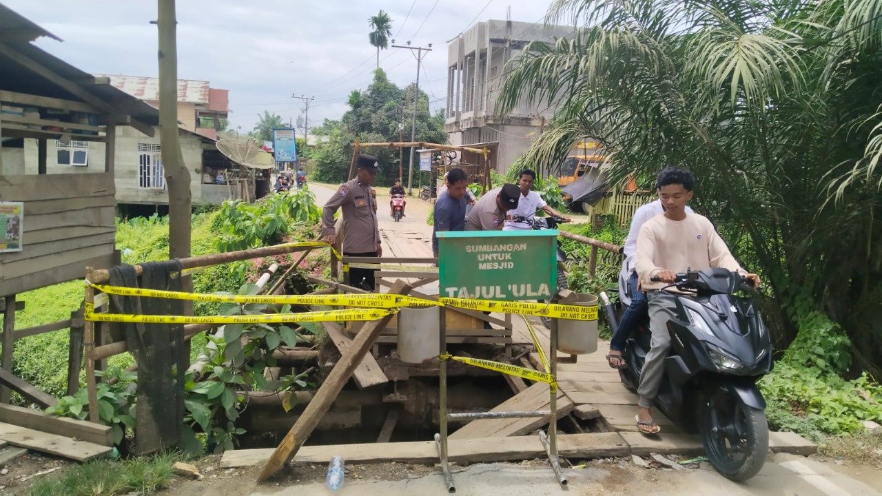 Personel Polsek Ranto Peureulak, Polres Aceh Timur, Polda Aceh, melakukan pemasangan Garis Polisi (Police Line) pada jembatan yang rusak di Desa Pertamina, Kecamatan Ranto Peureulak, Kabupaten Aceh Timur, Minggu, (20/04/2025). Pemasangan ini untuk mengantisipasi potensi bahaya bagi pengguna jalan.