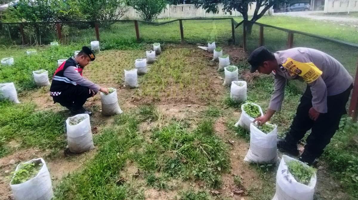 Kegiatan sederhana itu memanfaatkan jeda waktu menunggu azan magrib. Personel Polsek Simpang Jernih membersihkan lahan kosong yang rencananya akan ditanami bayam.