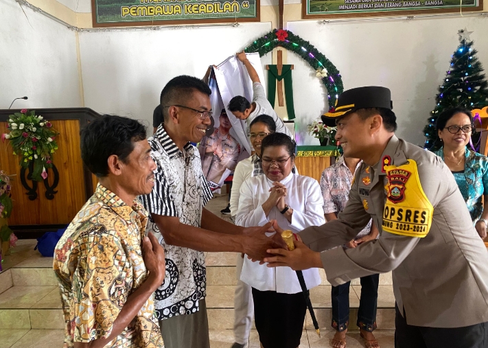 Dan sebagai tanda tali kasih Kapolres Buleleng kepada Umat Nasrani GKPB Bukit Zaitun Kedis, menyerahkan paket sembako kepada warga yang membutuhkan.