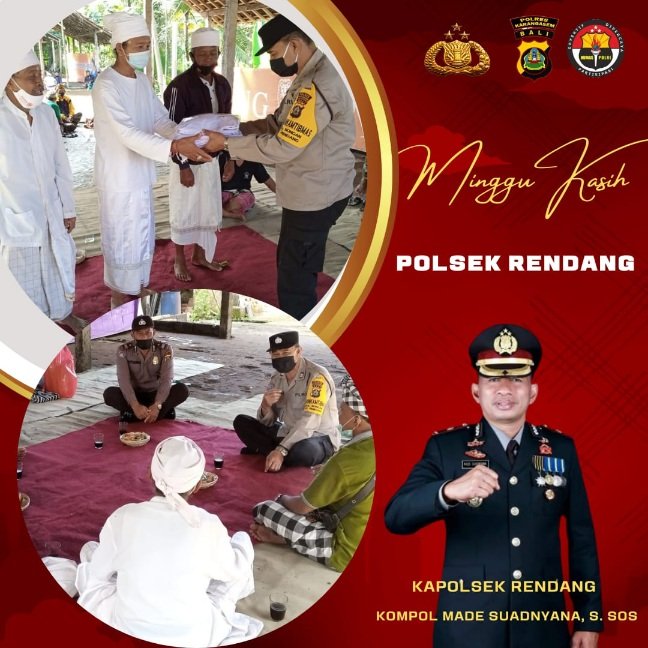 Polsek Rendang melaksanakan program Minggu Kasih dengan melakukan sambang ke warga masyarakat menyerahkan seperangkat pakaian adat Pemangku Pura di Banjar Bujaga Desa Nongan diharapkan bantu sosial ini dapat menjalin ikatan simakrama / kedekatan pihak kepolisian kepada warga masyarakat / tokoh agama di wilayah Rendang guna menjaga kamtibmas tetap kondusif. Minggu (8/9)