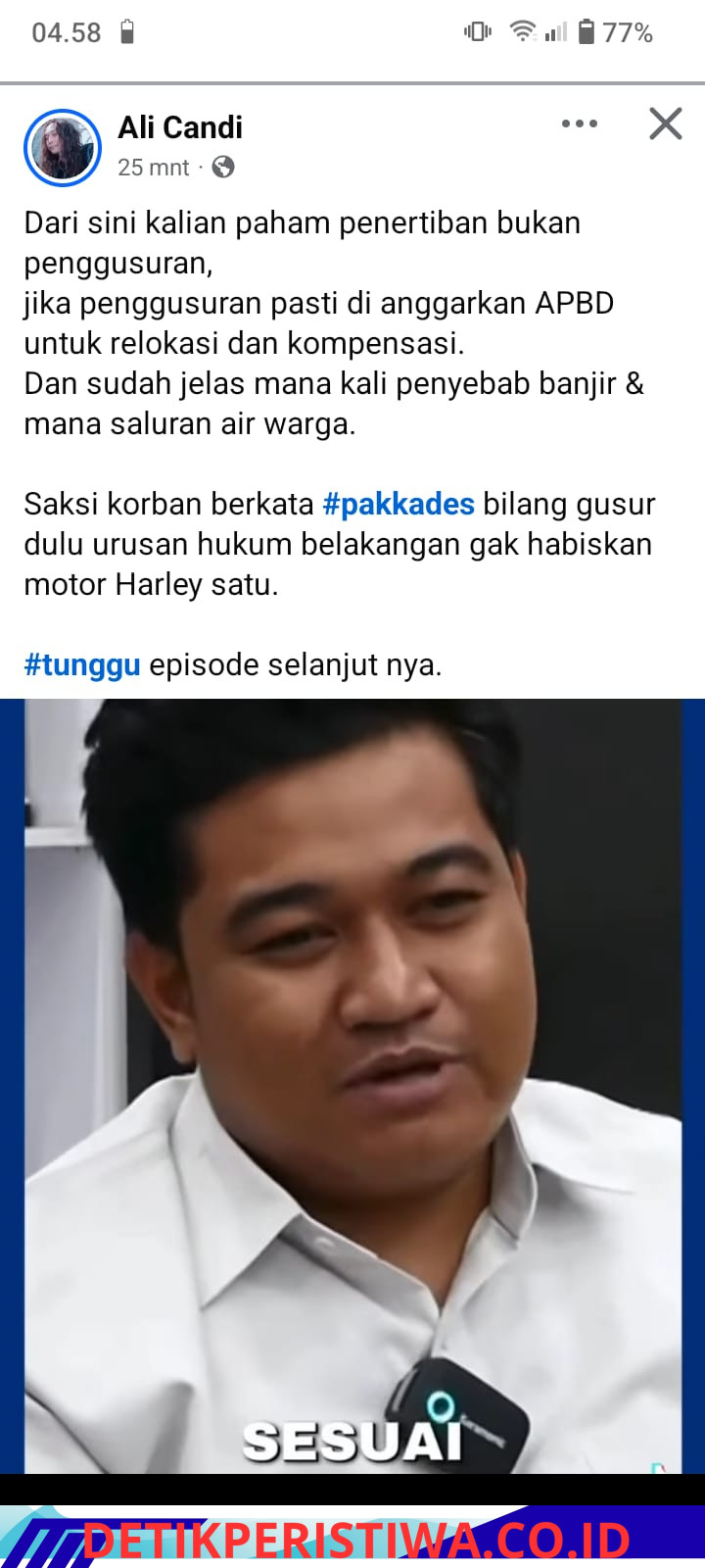 “Jika penggusuran pasti dianggarkan APBD untuk relokasi dan kompensasi,” tulisnya, sembari menyebut persoalan banjir dan saluran air sebagai latar belakang kebijakan tersebut.
