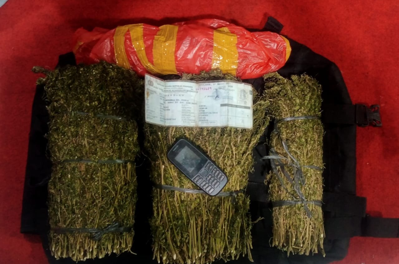 Saat itu JU mengendarai sepeda motor, setelah dilakukan penangkapan dan penggeledahan di dalam tas warna hitam yang dibawa JU, ditemukan 3 ikat gulung ganja kering yang dibalut menggunakan plastik merah”pungkasnya.