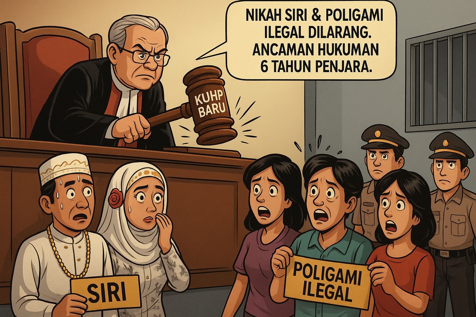 Pemerintah Indonesia resmi memberlakukan Kitab Undang-Undang Hukum Pidana (KUHP) baru, yang salah satu pasalnya mengatur larangan terhadap praktik nikah siri dan poligami ilegal. Pasal ini menyebut bahwa siapa pun yang melakukan pernikahan tanpa pencatatan resmi negara bisa dikenakan sanksi pidana hingga 6 tahun penjara.