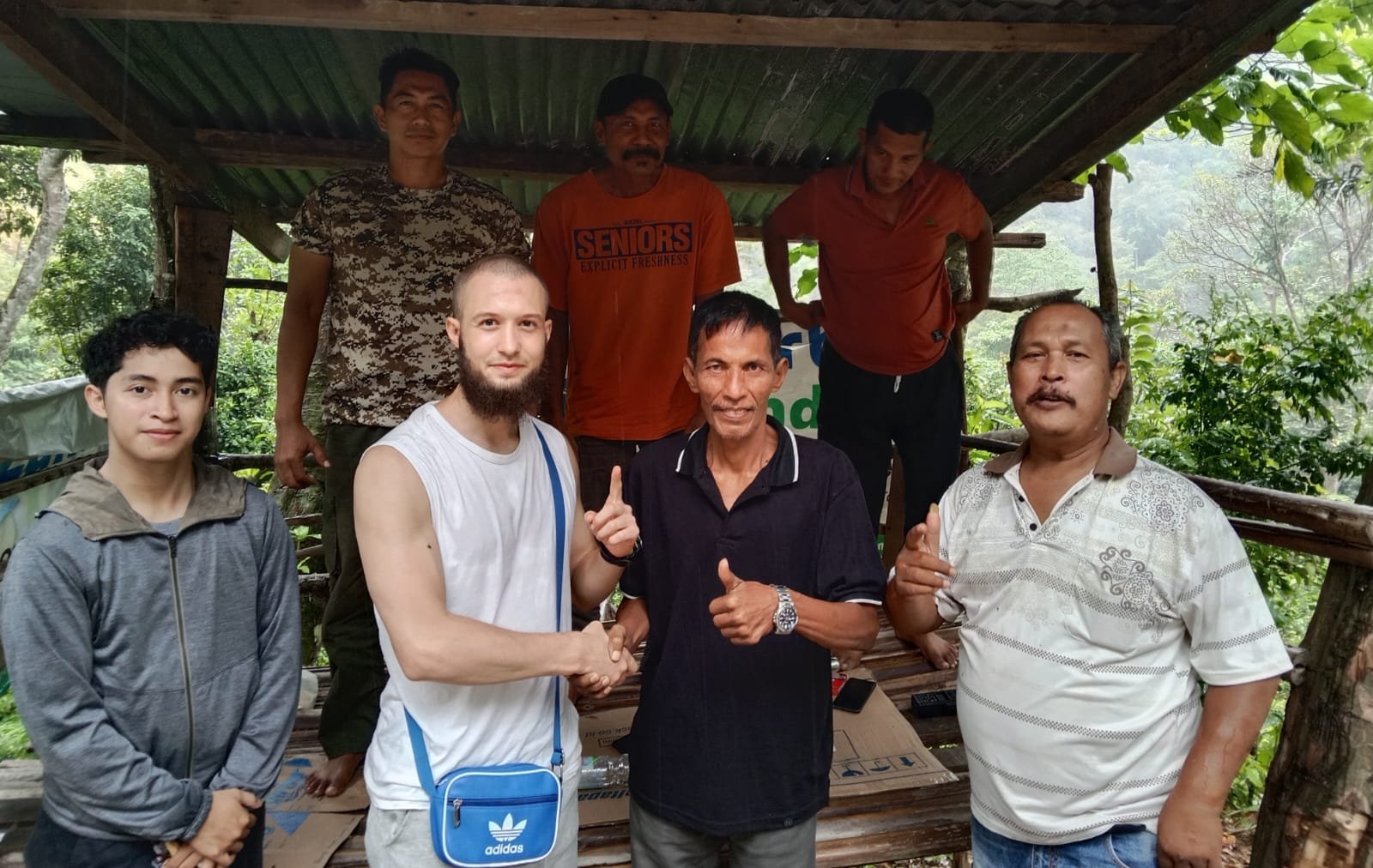 Binyamin, wisatawan asal Swiss (Eropa), berpose bersama para pengelola Objek Wisata Alam Glee Taron di Gampong Leu Ue, Kecamatan Darul Imarah, Kabupaten Aceh Besar, Sabtu, 12 Oktober 2025.