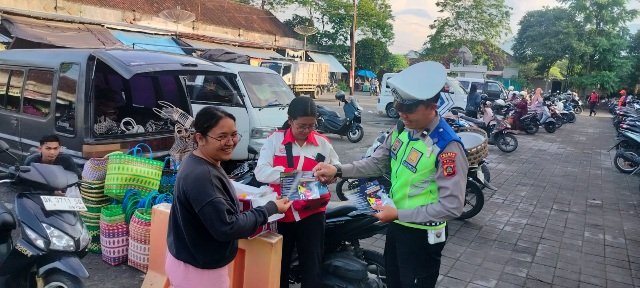 Personil Sat Lantas Polres Karangasem Membagikan brosur tertib berlalulintas di Pasar Timur Amlapura, guna terwujudnya keselamatan dalam berkendara dalam rangka Ops Keselamatan Agung 2026. Pada hari Sabtu, 7 Maret 2026 pukul 09.00 Wita.
