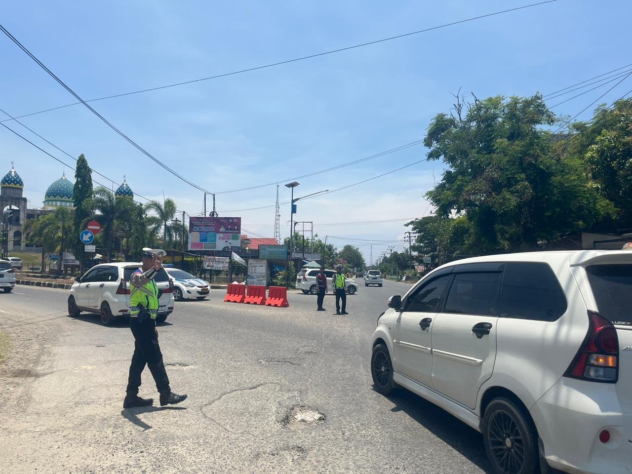 Personel Satlantas Polres Lhokseumawe dan personil Pos Pam Lebaran Idul Fitri 1445 H melakukan kegiatan pengamanan dan pengaturan serta menyampaikan imbauan kamtibmas di jalan di Jalan Umum Medan – Banda Aceh, Sp. Jalan Elak, Desa Alue Awe, Kecamatan Muara Dua, Kota Lhokseumawe, sabtu (13/4/2024).