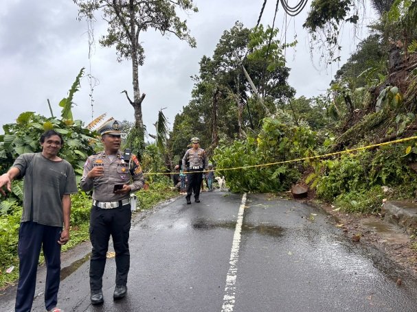 Gerak cepat Sat Lantas dalam melakukan pengaturan arus lalu lintas dan pemasangan rambu peringatan pasca terjadinya longsor di kawasan rawan bencana di Desa Kutabali, Kecamatan Bebandem, Kabupaten Karangasem. Pada Rabu, 10 September 2025.