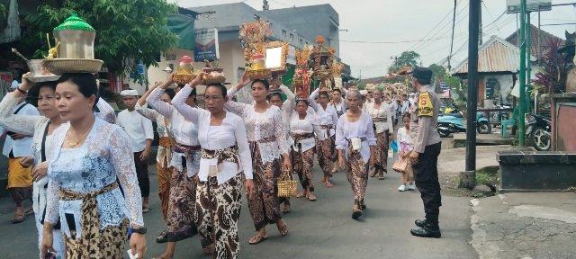 Personil Polsek Sidemen memberikan Pengamanan dan Pengaturan Arus Lalu Lintas Kegiatan Ida Betara Pura Dalem Hyang Taluh Mesucian Ke Pura Taman Dd. Tengah Desa Sidemen, Kecamaran Sidemen. Pada Senin, 16 Pebruari 2026 pukul 10.00 wita
