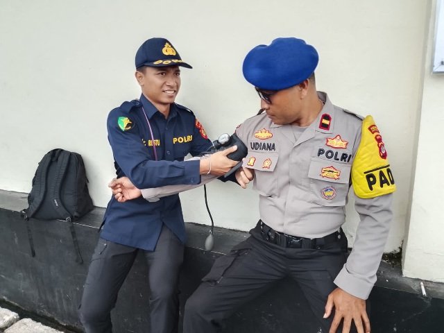 Pemeriksaan ini meliputi pengecekan tekanan darah atau tensi untuk memantau kondisi vital anggota serta pemberian vitamin dan suplemen guna menjaga imunitas tubuh di tengah padatnya jadwal pengamanan. Selain pemeriksaan fisik, IPDA dr. Restu juga memberikan kesempatan bagi personel untuk berkonsultasi mengenai keluhan kesehatan ringan agar dapat segera ditangani secara medis di lapangan.