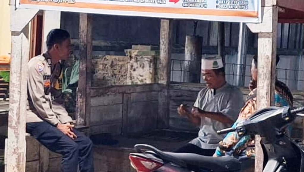 Sambil berbincang dengan warga, Bripka Toni Irsan mengingatkan warga yang sedang berjaga untuk selalu waspada terhadap segala bentuk tindak kejahatan.