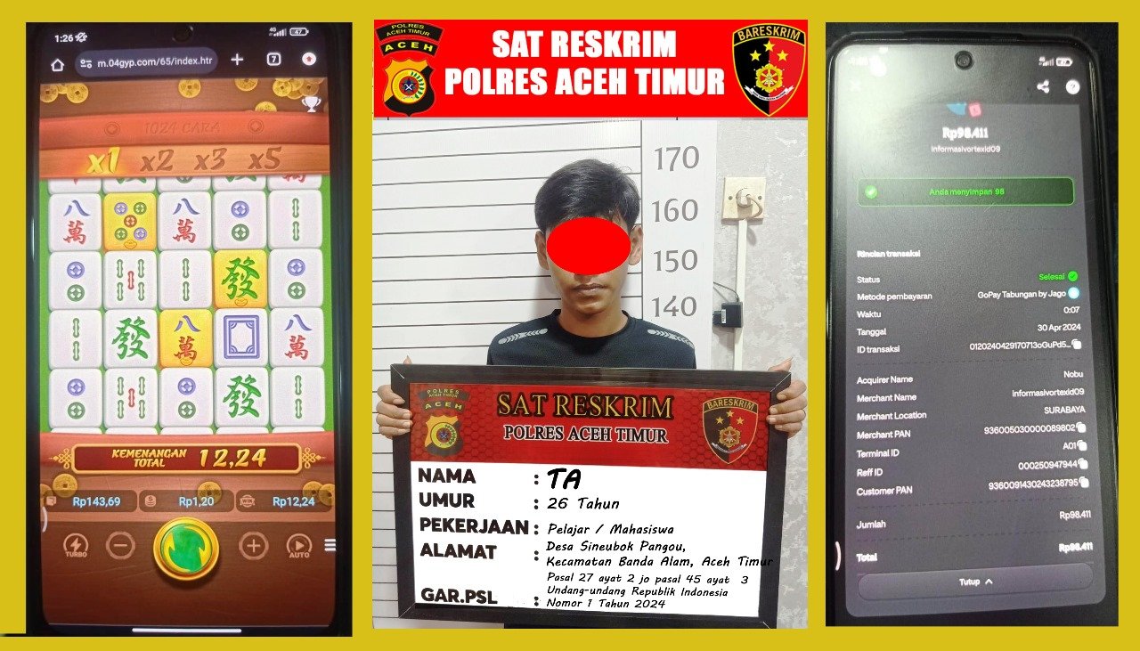 Kapolsek Banda Alam Polres Aceh Timur Polda Aceh Iptu Saidir, S.H. pada hari Senin, (29/04/2024) malam memimpin patroli wilayah. Saat melintas di sebuah warung kopi di Desa Sineubok Pangou sekira pukul 23.30 WIB, Kapolsek bersama sejumlah anggotanya mendapati TA sedang bermain HP. Ketika dihampiri oleh petugas, warga Desa Sineubok Pangou tersebut menunjukkan gelagat yang mencurigakan, kemudian dilakukan pemeriksaan terhadap HP milik TA dan didapati ia sedang bermain judi online,” ungkap Kasat Reskrim Polres Aceh Timur Iptu Muhammad Rizal, S.E.,S.H.,M.H., Selasa, (30/04/2024).