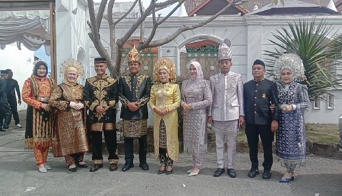 Pemandangan istimewa terlihat dari kekompakan seluruh jajaran Pemerintah Kabupaten (Pemkab) Bireuen, termasuk para kepala dinas dan istri, yang mengenakan pakaian adat khas Aceh. Bupati Bireuen, H. Mukhlis, ST, dan istri, *Sadriah Mukhlis*, turut ambil bagian dengan busana adat Aceh modern berwarna kuning dan hitam yang tampak serasi dan elegan.