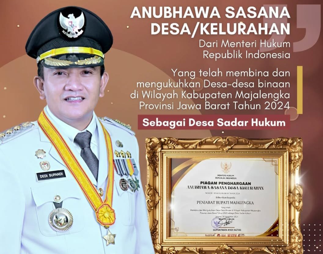 Penghargaan “Anubhawa Sasana Desa” dari Menteri Hukum RI untuk 9 desa sadar hukum Tahun 2024 di Kabupaten Majalengka yaitu Desa Sadawangi, desa Padarek, Desa Cisalak, Desa Palasah, Desa Sukawana, Desa Bojong Cideres, Desa Gandasari, Desa Cimuncang dan Desa Genteng.( Aboen)