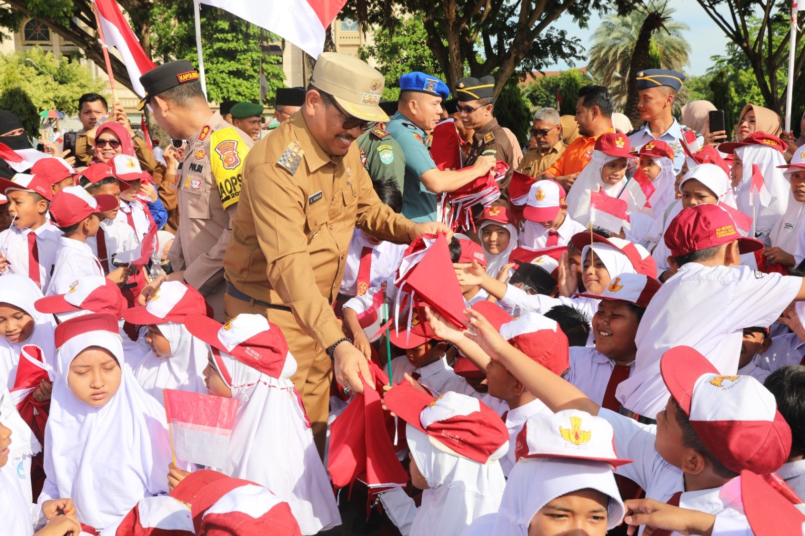 Launching kegiatan pembagian 10 juta bendera merah putih diawali dengan apel gabungan yang dipimpin langsung oleh Penjabat (Pj) Wali Kota A Hanan yang bertindak sebagai pembina apel.