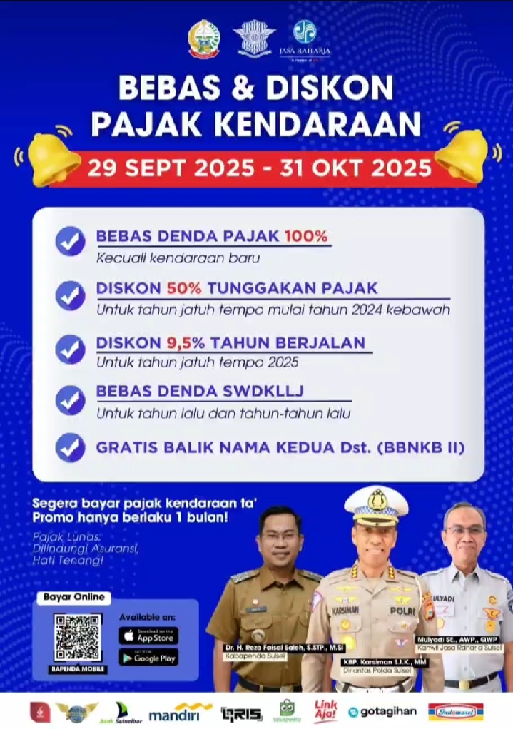 Program ini berlangsung mulai 29 September hingga 31 Oktober 2025 dan berlaku untuk seluruh wajib pajak kendaraan bermotor di Sulsel.
